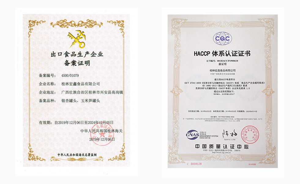 桂林宏鑫食品有限公司通過出口食品生產企業備案,獲得HACCP體系認證,具備進口貿易資質。銀杏罐頭大量出口至日本、中國臺灣、香港、新加坡、泰國、澳洲等,是全球規(guī)模大的銀杏罐頭加工廠。